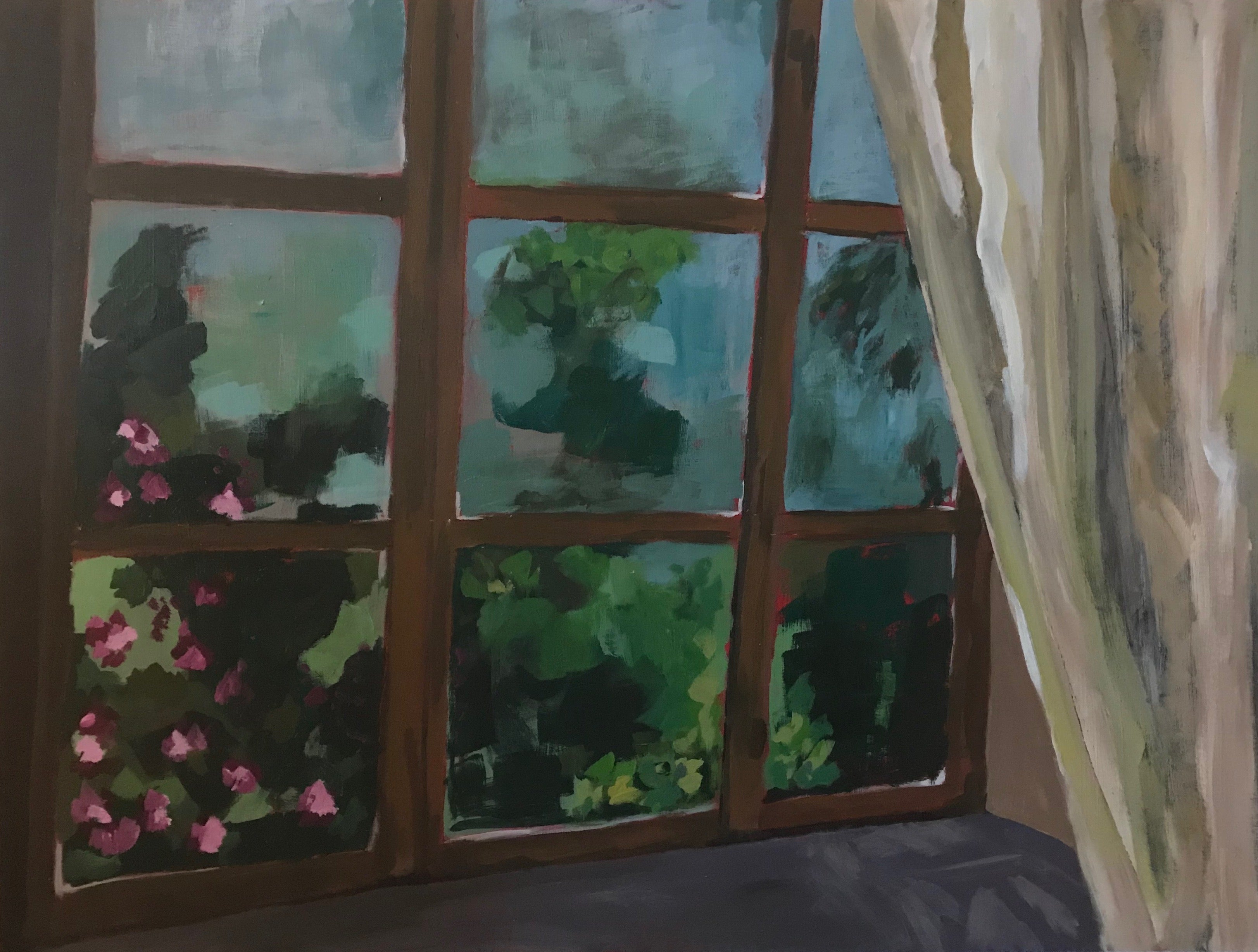 This painting is part of a series of four paintings of window scenes. These four are the largest I have painted to date. My typical daily paintings are 6″x6″, so this has been quite an adventure.