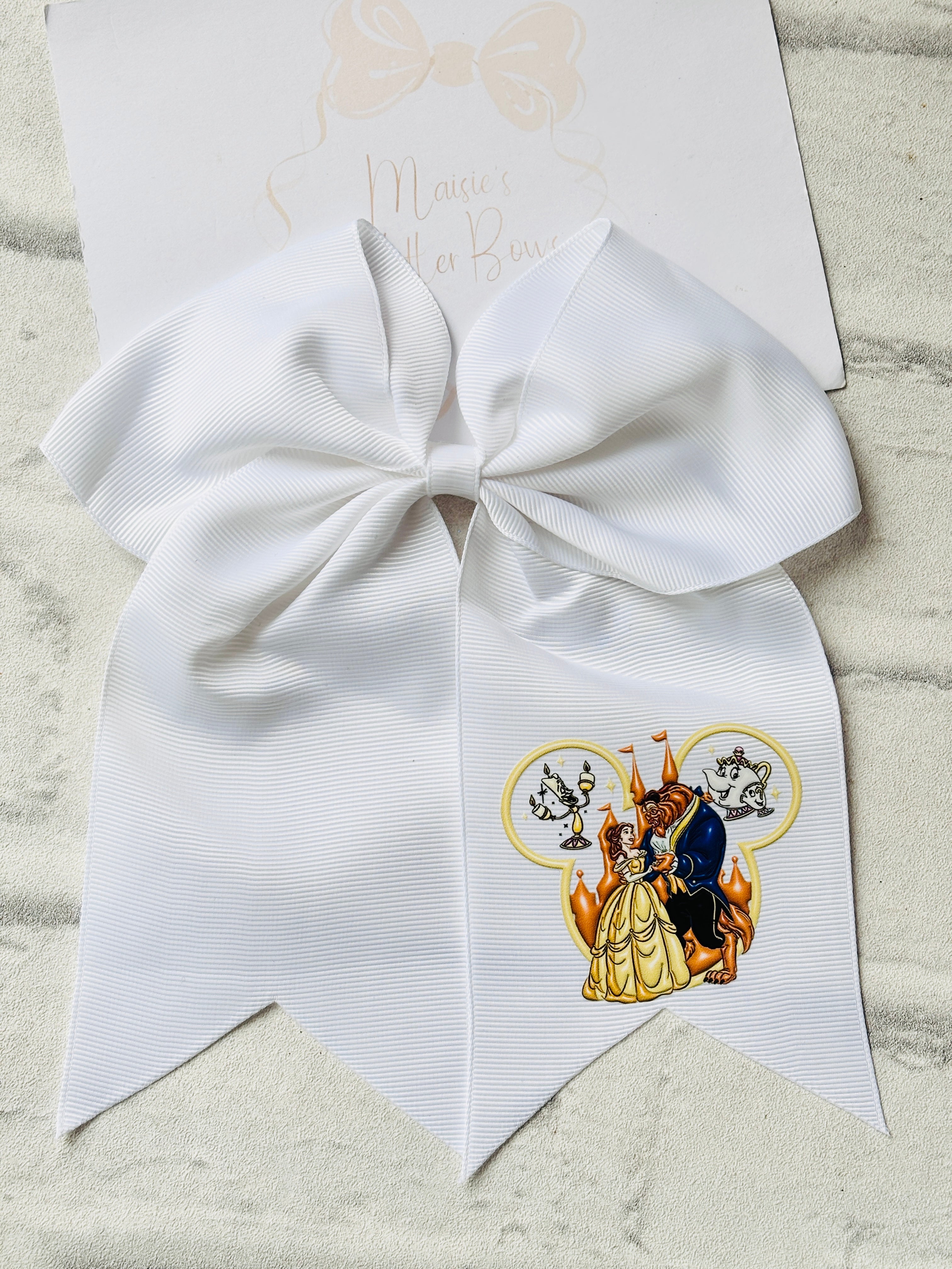A large ribbon ponytail bow which measures approximately 7.5 inches x 6.5 inches complete with a DTF transfer