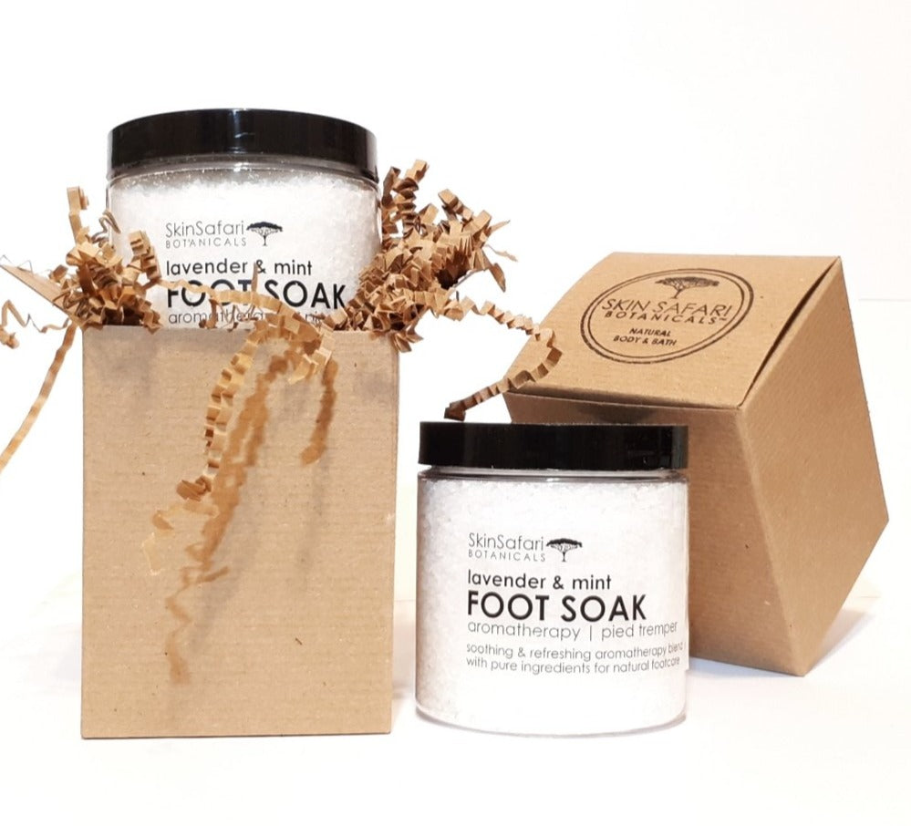 Our Lavender & Mint Foot Soak Salts are blended with Pure Sea Salt, Epsom Salts, Essential oils selected for their relaxing and refreshing qualities and Rice Bran Oil which will gently moisturizes dry skin.