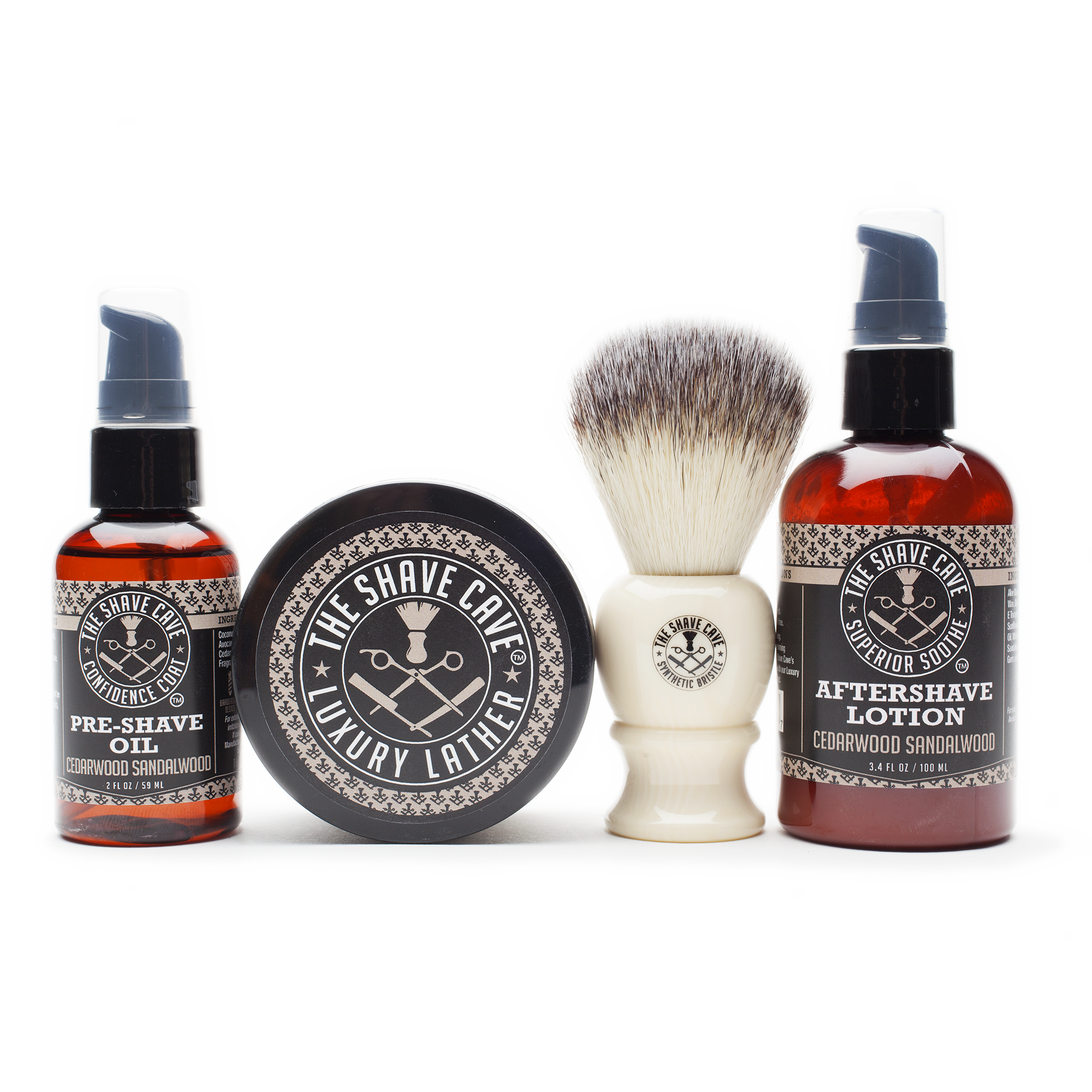 Shave like a gentleman. The trifecta of our shave line; Pre Shave Oil, Shave Cream & Aftershave Lotion, including a synthetic shave brush. (brush color will vary)
