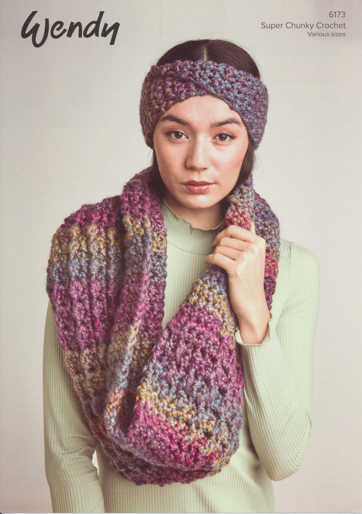 This Wendy super chunky crochet pattern leaflet 6173 will instruct you on how to create a lady’s cowl and headband.